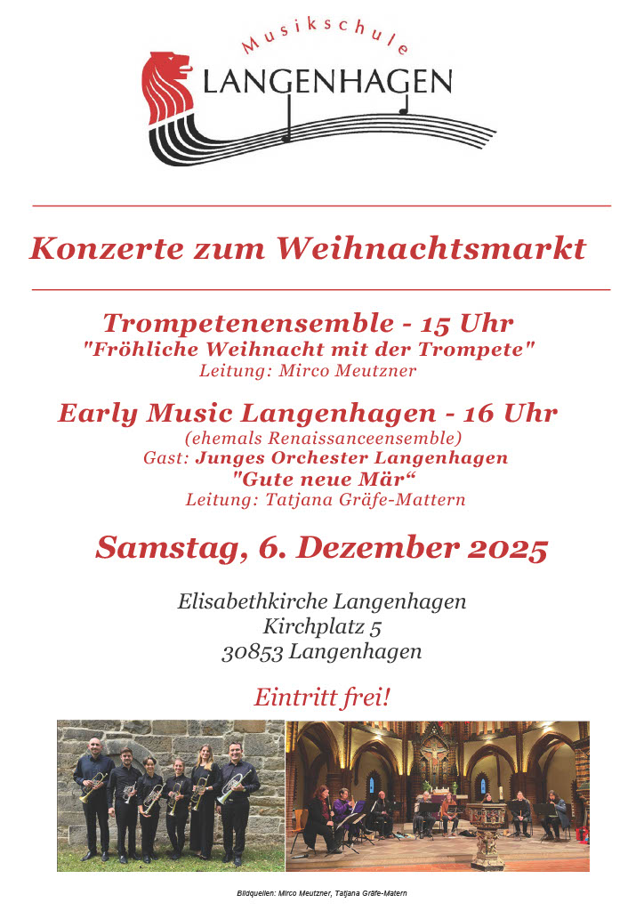 Das Trompetenensemble spielt in der Elisabethkirche ein Adventskonzert. Während um die Kirche der Weihnachtsmarkt stattfindet, erklingen die Klänge von Trompete und Flügelhorn mit Musik zum Ballett „Der Nußknacker“, aus dem Weihnachtsoratorium von J.S. Bach und allerlei adventlich-weihnachtlichen Klängen.